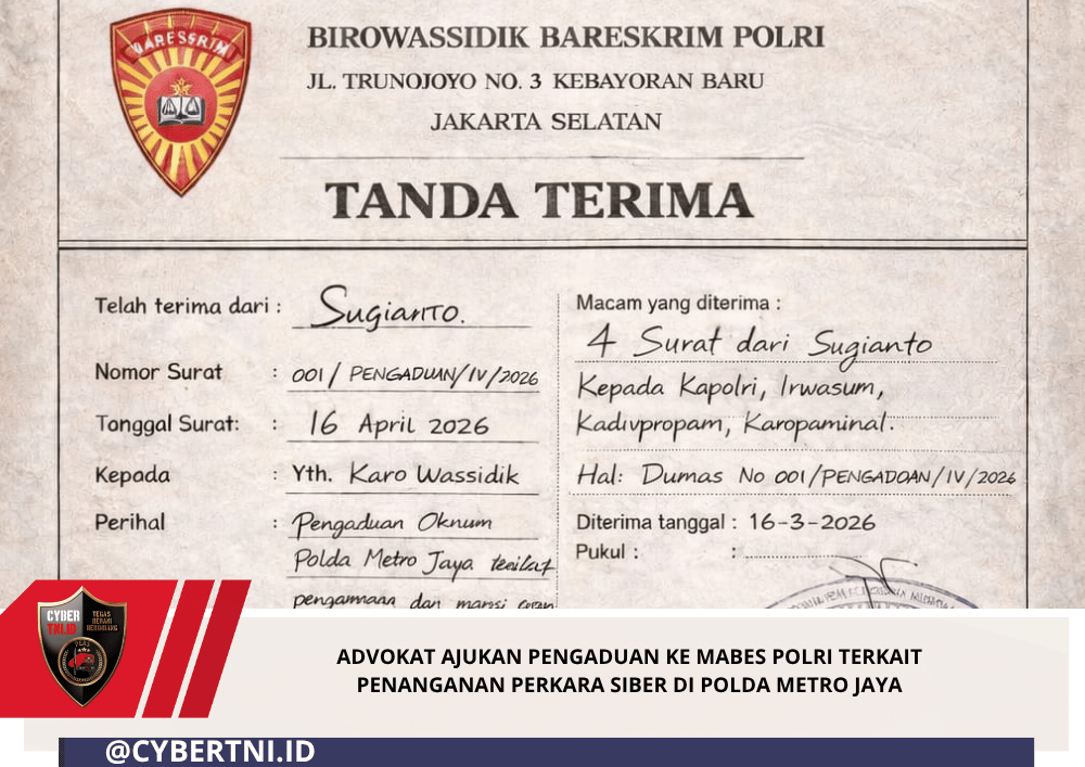 CyberTNI.id | TANGERANG, 20 April 2026 – Seorang advokat bernama Sugianto menyampaikan kronologi serta mengajukan pengaduan ke Mabes Polri terkait penanganan perkara dugaan tindak pidana Informasi dan Transaksi Elektronik (ITE) oleh Direktorat Reserse Siber Polda Metro Jaya, yang menurutnya perlu mendapat perhatian dalam aspek prosedural.