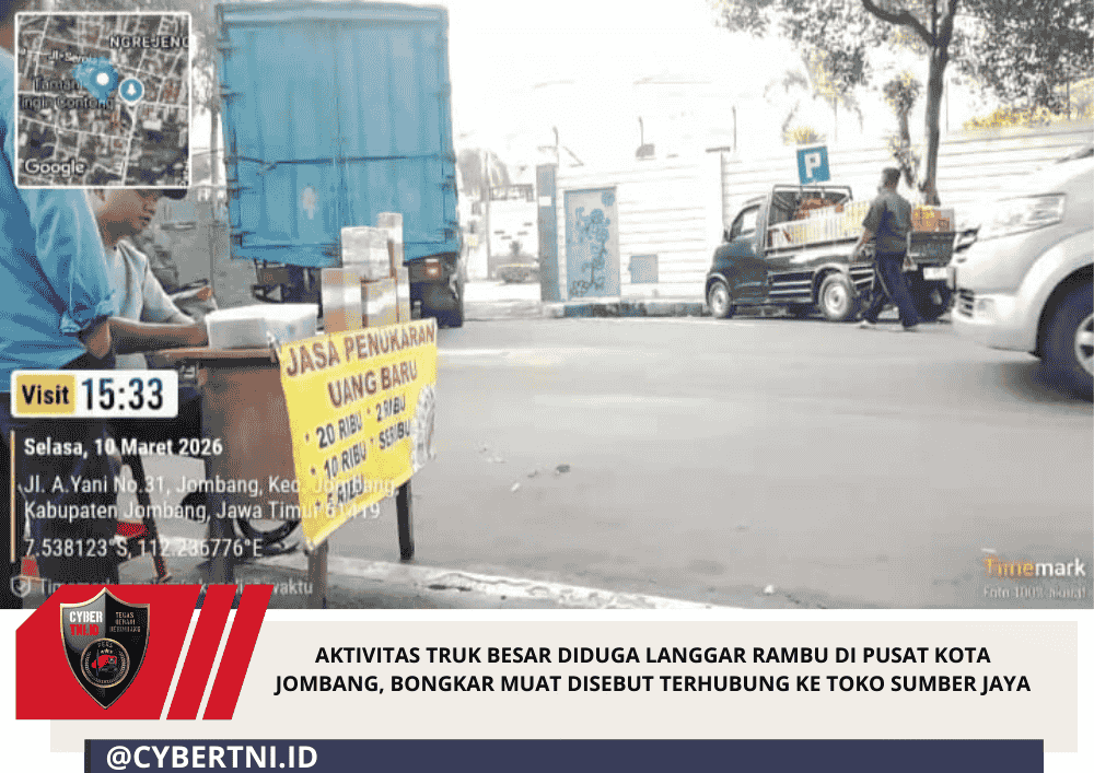 CyberTNI.id | JOMBANG, 10 Maret 2026 – Aktivitas kendaraan berat yang melintas dan melakukan bongkar muat barang di kawasan pusat kota Jombang kembali menjadi sorotan warga. Sebuah truk besar bermuatan yang memiliki lebih dari empat ban diduga melanggar rambu lalu lintas saat melintas dari arah Nol Kilometer Ringin Contong menuju barat di Jalan Ahmad Yani.