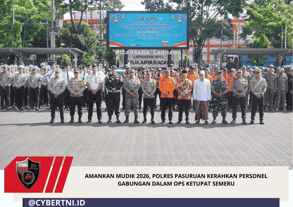 CyberTNI.id | PASURUAN – Polres Pasuruan mengerahkan personel gabungan dalam pengamanan arus mudik dan perayaan Hari Raya Idul Fitri 1447 Hijriah melalui Operasi Ketupat Semeru 2026. Kesiapan tersebut ditandai dengan pelaksanaan apel gelar pasukan di Lapangan Apel Sarja Arya Racana Polres Pasuruan, Kamis (12/3/2026) pagi.