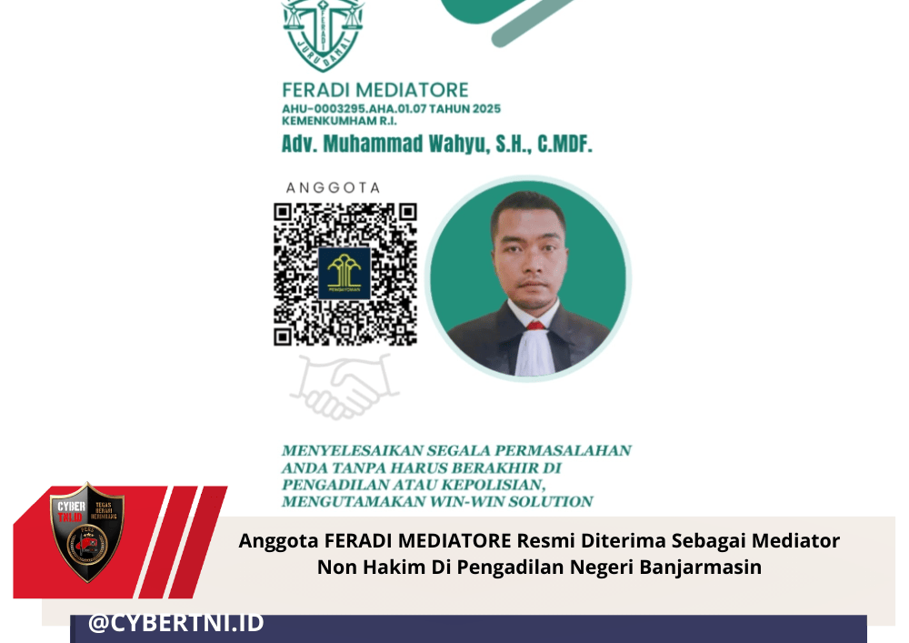 CyberTNI.id | BANJARMASIN – Organisasi/Perkumpulan mediator FERADI MEDIATORE kembali menunjukkan eksistensi dan kualitasnya di dunia hukum Indonesia. Hal ini dibuktikan dengan diterimanya salah satu anggotanya, Adv. Muhammad Wahyu, S.H., C.MDF., sebagai Mediator Non Hakim di Pengadilan Negeri (PN) Banjarmasin.