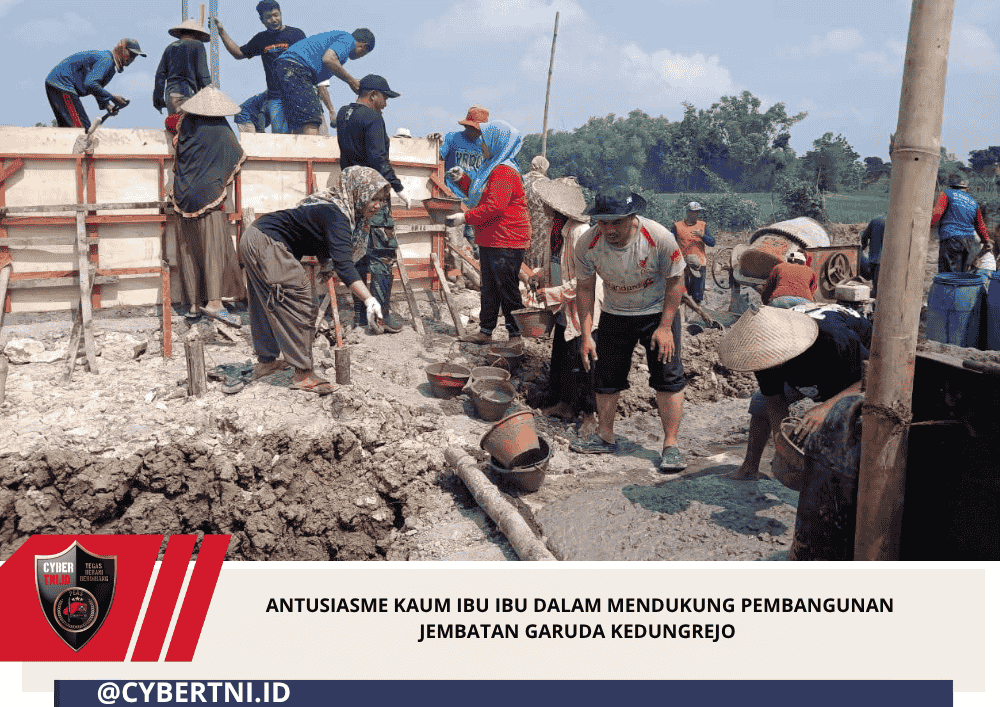CyberTNI.id| GROBOGAN – Semangat antusias warga bukan hanya dari kalangan bapak-bapak saja, melainkan peran para ibu-ibu rumah tangga juga turut ambil bagian membantu pembangunan jembatan gantung Garuda di Dusun Geneng Desa Kedungrejo Kecamatan Purwodadi Kabupaten Grobogan. Selasa (21/04/26).
