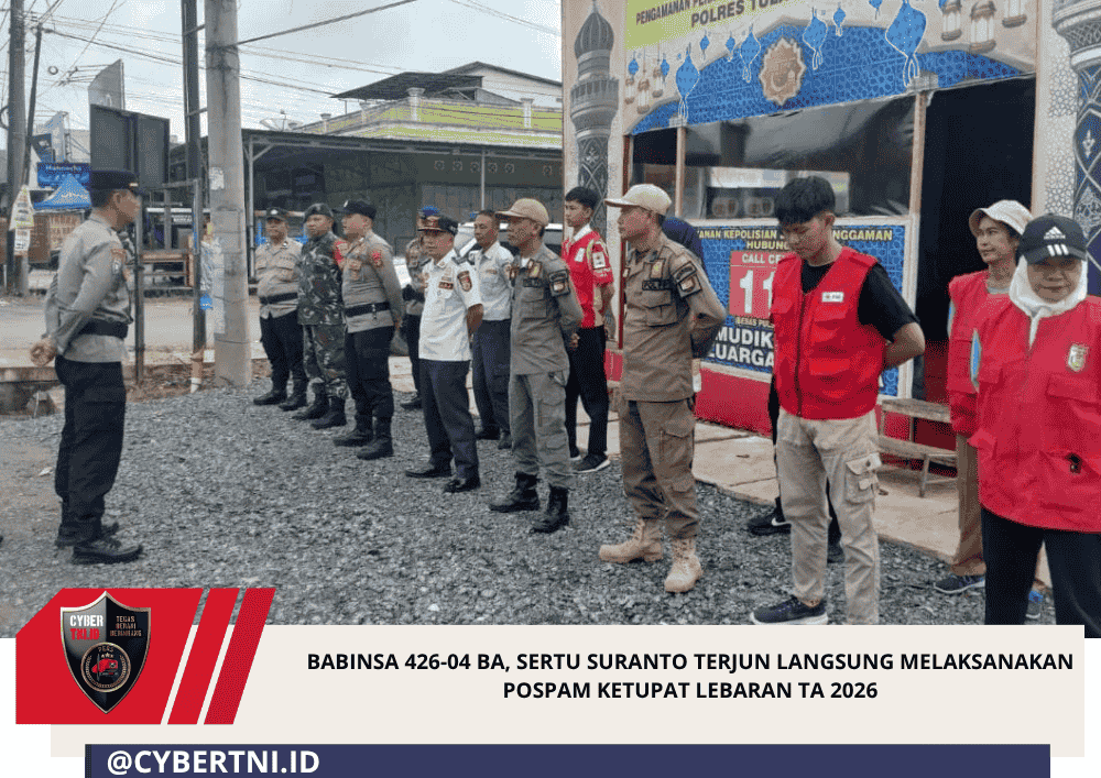 CyberTNI.id | Banjar Agung (Tulang Bawang) — Sertu Suranto, Babinsa Koramil 426-04/BA, turun langsung melaksanakan tugas dalam Pos Pengamanan (Pospam) Ketupat Lebaran Tahun Anggaran 2026 sebagai bagian dari upaya menjaga keamanan dan ketertiban masyarakat selama arus mudik dan balik Idulfitri, dikampung Banjar Agung, Kecamatan Banjar Agung, Kabupaten Tulang Bawang, pada Senin 23 Maret 2026.