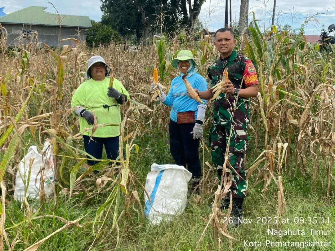 Kegiatan tersebut berlangsung di lahan pertanian milik Ibu Br. Sihotang, yang berlokasi di Kelurahan Nagahuta Timur, Kota Pematangsiantar. Dengan penuh semangat, Kopda J. Manik turut turun ke ladang, memetik jagung bersama pemilik lahan dan warga sekitar.