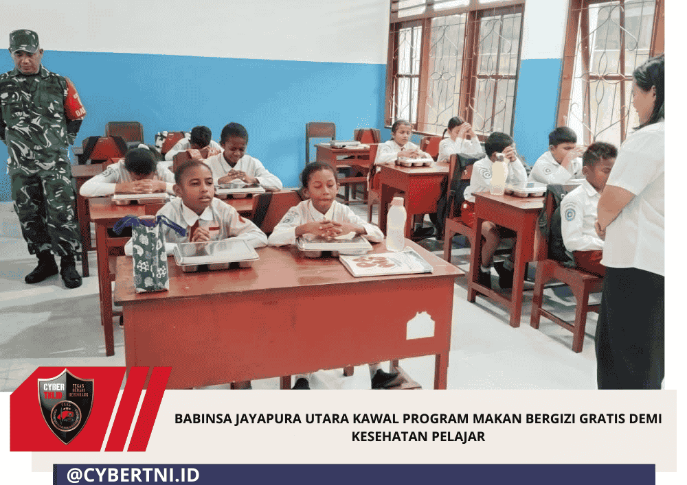 CyberTNI.id | Jayapura — Komitmen TNI Angkatan Darat dalam mendukung peningkatan kualitas gizi dan kesehatan anak usia sekolah terus diwujudkan melalui pendampingan Program Makan Bergizi Gratis (MBG). Kali ini, pendampingan dilakukan oleh Babinsa Koramil 1701-02/Jayapura Utara di SD YPK 1 Senasaba, Kelurahan Gurabesi, Distrik Jayapura Utara, Kota Jayapura, Senin (2/3/2026).