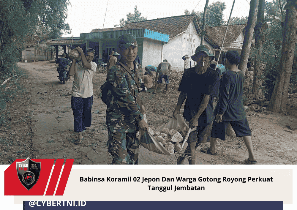CyberTNI.id | BLORA – Babinsa Koramil 02/Jepon Kodim 0721/Blora, Serma Marijani, bersama warga Desa Brumbung, Kecamatan Jepon, Kabupaten Blora, melakukan gotong royong pemasangan batu bronjong untuk memperkuat tanggul jembatan desa, Kamis (8/1/2026).