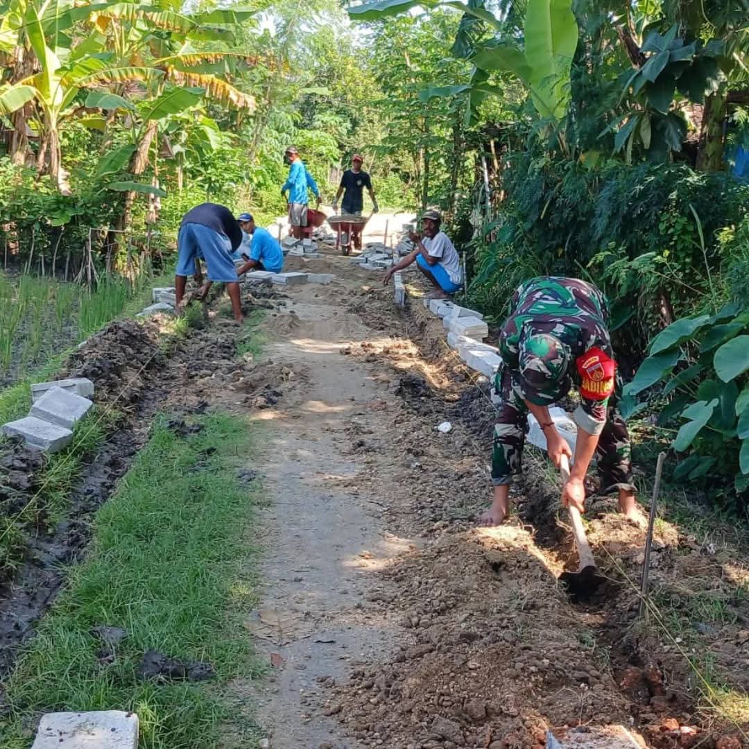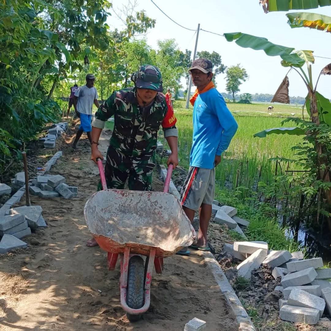CyberTNI.id | BLORA – Bintara Pembina Desa (Babinsa) Koramil 06/Jiken Kodim 0721/Blora, Sertu Arik Eko, bersama warga melaksanakan kerja bakti pemasangan paving block jalan di Desa Singonegoro, Kecamatan Jiken, Kabupaten Blora, Rabu (17/12/2025).