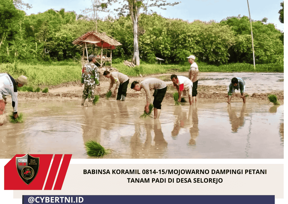 CyberTNI.id | Jombang — Babinsa Koramil 0814-15/Mojowarno, Serda Doni Saiful, melaksanakan pendampingan kegiatan tanam padi bersama para petani di Desa Selorejo, Kecamatan Mojowarno, Kabupaten Jombang, pada Minggu (18/01/2026).
