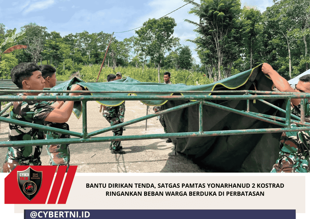 CyberTNI.id | Haumeniana, TTU – Satgas Pamtas RI–RDTL Sektor Barat Yonarhanud 2 Kostrad melalui Pos Haumeniana melaksanakan kegiatan bantuan kemanusiaan dengan membantu mendirikan tenda kedukaan bagi warga di Desa Haumeniana, Kecamatan Bikomi Nilulat, Kabupaten Timor Tengah Utara (TTU), Sabtu (07/03/2026).