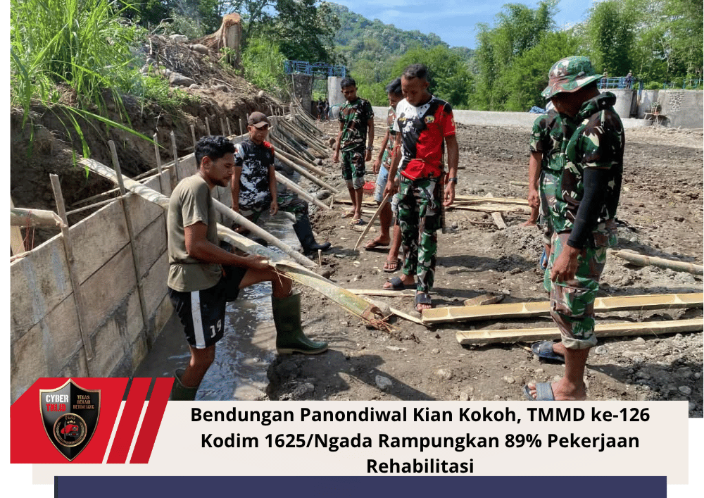 CyberTNI.id | Ngada, 3 November 2025 – Program TNI Manunggal Membangun Desa (TMMD) ke-126 yang dilaksanakan oleh Kodim 1625/Ngada terus menunjukkan perkembangan signifikan. Hingga awal November ini, kegiatan pengecoran sayap Bendungan Panondiwal yang berlokasi di Desa Benteng Tawa, Kecamatan Riung Barat, Kabupaten Ngada, telah mencapai progres pekerjaan sebesar 89 persen.