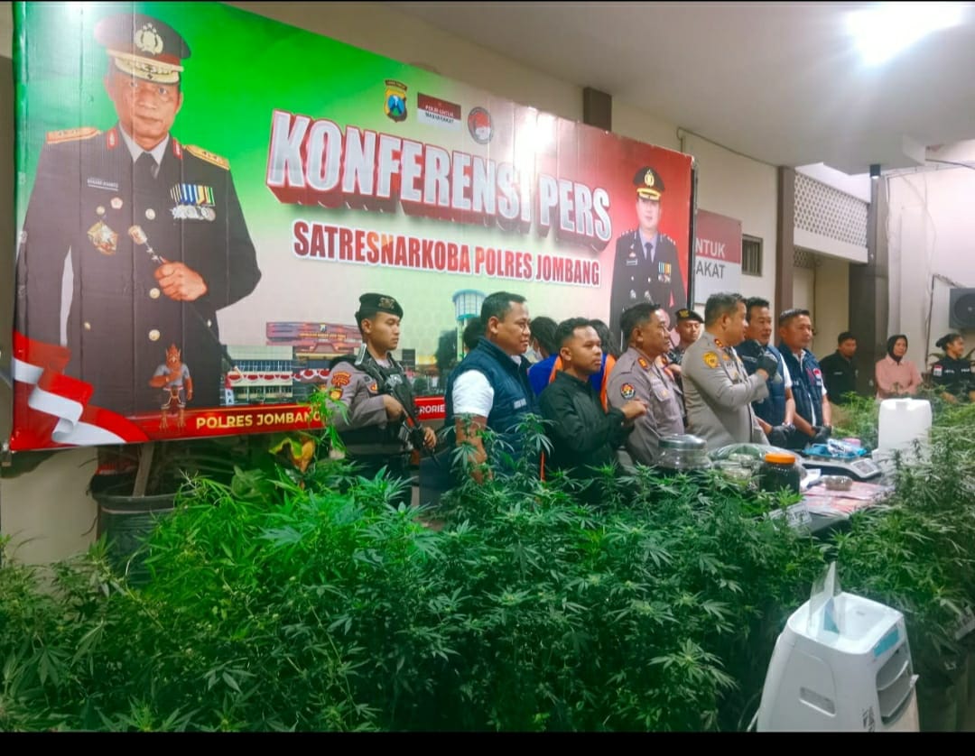 CyberTNI.id ,JOMBANG — Satuan Reserse Narkoba Polres Jombang berhasil membongkar praktik budidaya narkotika golongan I jenis ganja yang dijalankan secara terorganisir dan melibatkan jaringan lintas daerah. Dari pengungkapan ini, polisi mengamankan empat tersangka beserta ratusan tanaman ganja dan berbagai peralatan modern untuk pembudidayaan.