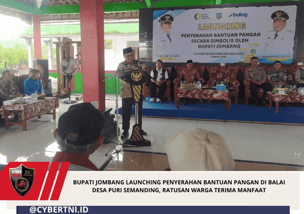 CyberTNI.id | JOMBANG – 10/04/2026 —Pemerintah Kabupaten Jombang bersama Badan Pangan Nasional dan Perum Bulog menggelar kegiatan Launching Penyerahan Bantuan Pangan secara simbolis kepada masyarakat, bertempat di Balai Desa Puri Semanding, Kecamatan Plandaan, Kabupaten Jombang. Kegiatan ini menjadi bagian dari program pemerintah dalam menjaga stabilitas pangan sekaligus membantu masyarakat menghadapi dinamika ekonomi.