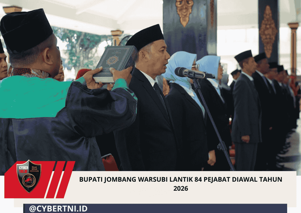 CyberTNI.id | JOMBANG — Bupati Jombang, Warsubi, secara resmi melantik dan mengambil sumpah janji 84 pejabat manajerial untuk mengisi posisi strategis di lingkungan Pemerintah Kabupaten Jombang pada Kamis (15/1/2026) sore. Acara yang berlangsung khidmat di Pendopo Pemkab Jombang tersebut disiarkan secara langsung oleh Dinas Kominfo melalui akun Instagram resmi @Jombangkab.