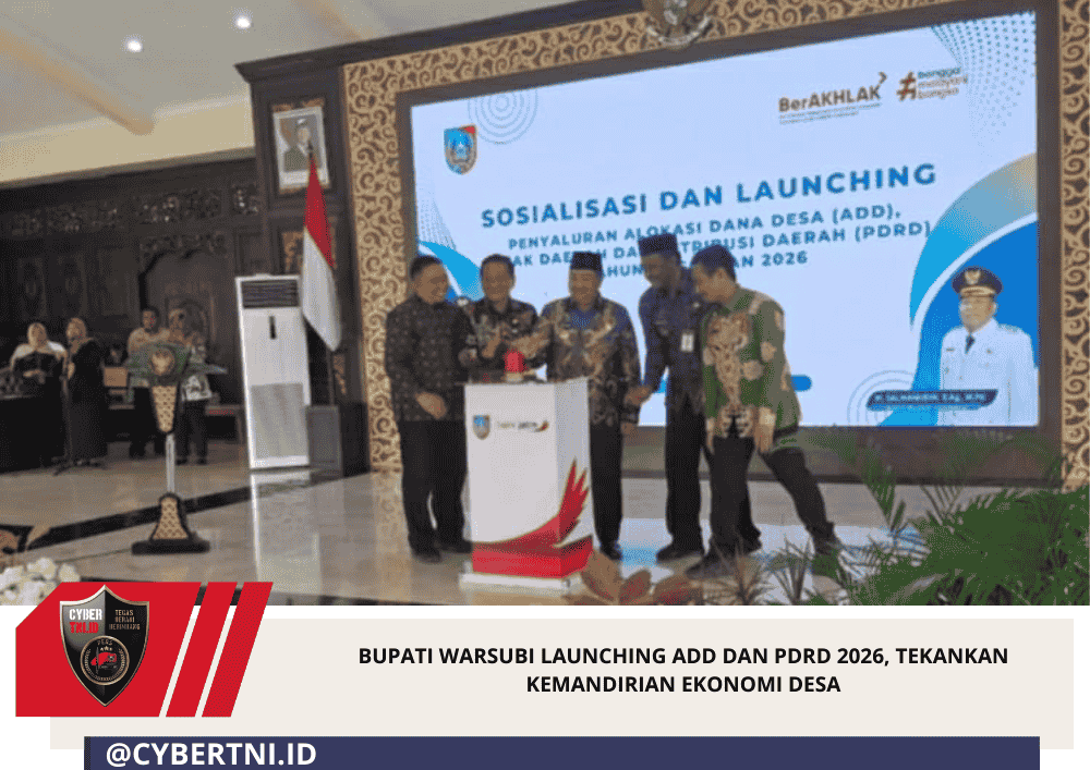 CyberTNI.id | JOMBANG – Pemerintah Kabupaten Jombang melalui Dinas Pemberdayaan Masyarakat dan Desa (DPMD) resmi memulai tahapan penyaluran dana desa tahun anggaran 2026. Hal ini ditandai dengan agenda “Sosialisasi dan Launching Penyaluran Alokasi Dana Desa (ADD) serta Pajak Daerah dan Retribusi Daerah (PDRD)” yang digelar di Pendopo Kabupaten Jombang, Kamis (5/2/2026) siang.