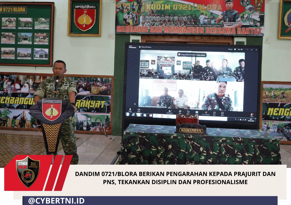 CyberTNI.id | Blora, 30 Januari 2026 – Komandan Kodim 0721/Blora Letkol Inf Agung Cahyono, S.Sos., M.Han., memberikan pengarahan kepada seluruh prajurit dan Pegawai Negeri Sipil (PNS) Kodim 0721/Blora di Aula Makodim 0721/Blora, Jalan Pemuda No. 44 Blora, Jumat (30/1/2026).