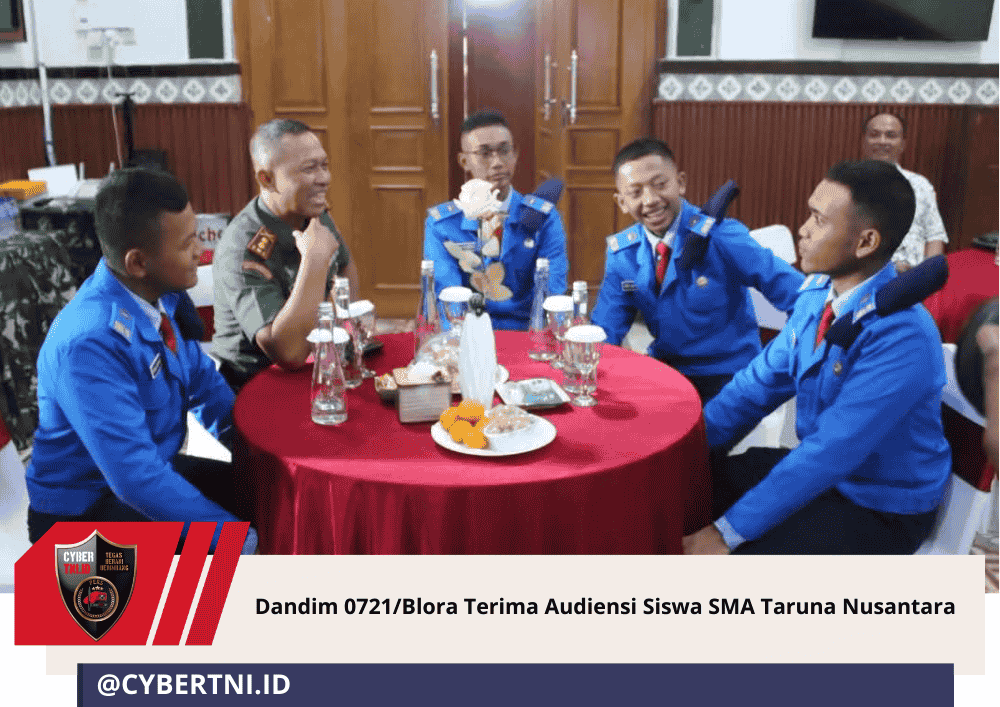 CyberTNI.id | Blora, Rabu 24 Desember 2025 – Komandan Kodim 0721/Blora Letkol Inf Agung Cahyono, S.Sos., M.Han., didampingi Ketua Persit KCK Cabang XLII Dim 0721/Blora Ny. Fitria Agung Cahyono menerima kunjungan audiensi siswa SMA Taruna Nusantara (SMA TN) Kampus Malang, Jawa Timur, di Markas Kodim 0721/Blora, Jalan Pemuda No. 44 Blora, Rabu (24/12/2025).