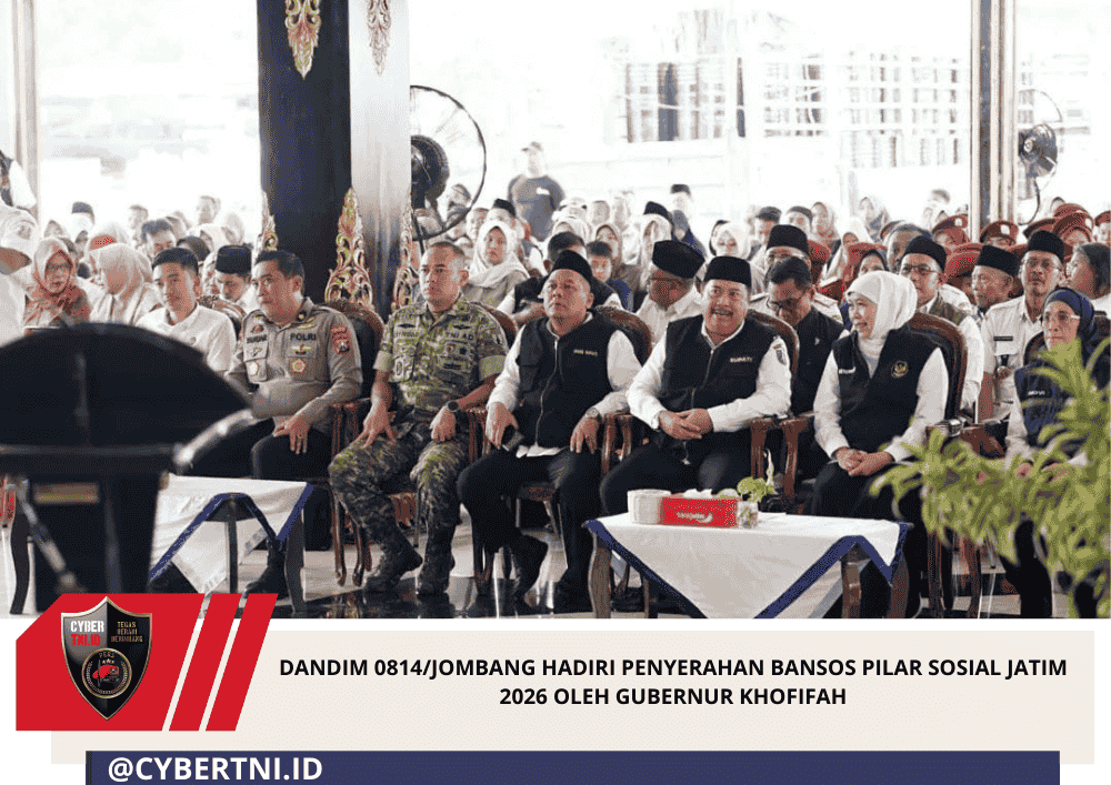 CyberTNI.id | Jombang — Dandim 0814/Jombang Letkol Kav Dicky Prasojo, S.H., M.Han., menghadiri kegiatan Penyerahan Bantuan Sosial dan Tali Asih Pilar Sosial Provinsi Jawa Timur Tahun 2026 yang diserahkan langsung oleh Gubernur Jawa Timur Dr. (H.C. UA) Hj. Khofifah Indar Parawansa di Pendopo Kabupaten Jombang.
