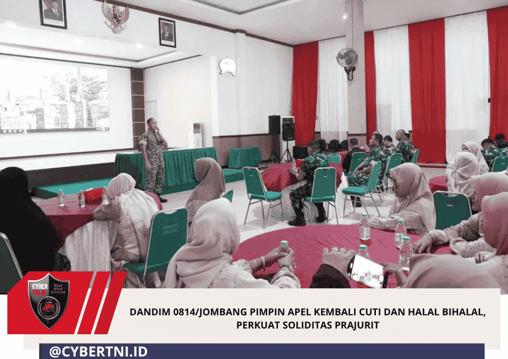CyberTNI.id | Jombang — Apel kembali cuti Hari Raya dipimpin langsung Dandim 0814/Jombang Letkol Kav Dicky Prasojo, S.H., M.Han., dilanjutkan dengan kegiatan Halal Bihalal bersama Ketua Persit KCK Cabang XXIX Dim 0814 Ny. Icha Dicky, prajurit, PNS, dan Persit di Aula Kodim, Rabu (25/3/2026).