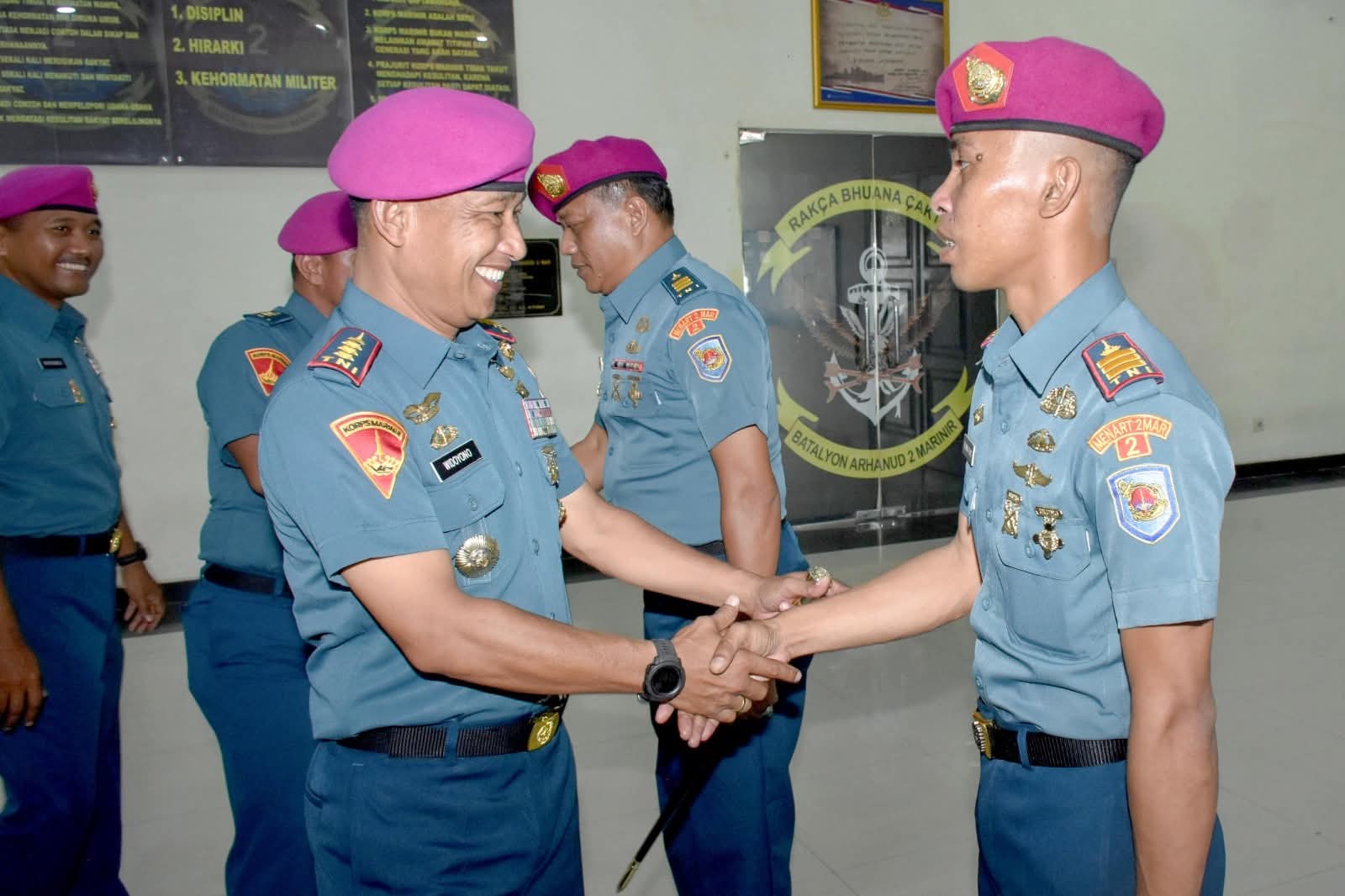 CyberTNI.id | Surabaya,Rabu 01 Oktober 2025 — TNI AL. Dispen Kormar (Surabaya). Ditandai pengakuan atas prestasi dan dedikasi seorang Perwira, Komandan Resimen Artileri 2 Marinir (Danmenart 2 Mar) Kolonel Mar Widoyono, M.Tr.Hanla., M.M, memimpin pelaksanaan acara laporan Korps Kenaikan Pangkat Perwira Resimen Artileri 2 Marinir (Menart 2 Mar) kala waktu 1 Oktober bertempat di Ruang Rekreasi Batalyon Arhanud 2 Marinir, Karangpilang-Surabaya. Rabu (01/10/2025).