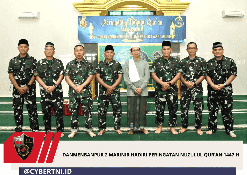 CyberTNI.id | Surabaya – Komandan Resimen Bantuan Tempur 2 Marinir (Danmenbanpur 2 Mar) Kolonel Marinir Rizal Ikqwan Nusofa, S.H., M.Tr. Hanla bersama para prajuritnya mengikuti peringatan Nuzulul Qur’an 1447 H / 2026 M di Masjid Al Huda, Kesatrian Marinir Soetedi Senaputra Karangpilang, Surabaya, Kamis (12/03/2026).