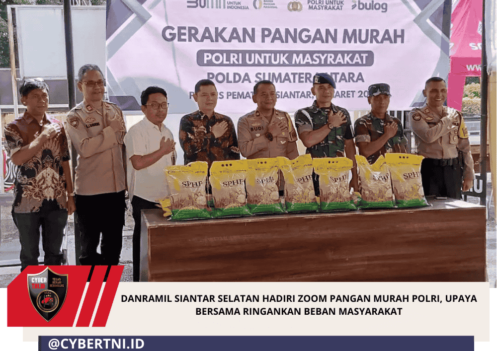 CyberTNI.id | Pematangsiantar – Komitmen membantu masyarakat mendapatkan kebutuhan pokok dengan harga terjangkau terus diwujudkan melalui sinergi lintas instansi. Hal itu terlihat saat Dandim 0207/ Simalungun diwakili Danramil 03/Siantar Selatan Kodim 0207/Simalungun, Kapten Inf Sugiarto menghadiri kegiatan Zoom Pangan Murah Polri untuk masyarakat jajaran Polda Sumatera Utara yang digelar di Mako Polres Pematangsiantar, Jumat (13/3/2026).