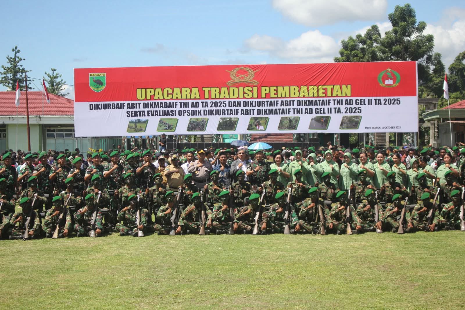 CyberTNI.id | Manokwari, Senin 13 Oktober 2025 — Danrindam XVIII/KSR, Brigjen Yusuf Sampetoding, S.I.P., secara resmi menutup Upacara Tradisi Pembaretan Dikjurbaif Abit Dikmaba Infanteri TNI AD Gelombang I TA 2025 dan Dikjurtaif Abit Dikmata Infanteri TNI AD Gelombang II TA 2025, yang digelar di Lapangan Upacara Mako Rindam XVIII/KSR, Manokwari Selatan, pada Senin (13/10/2025).