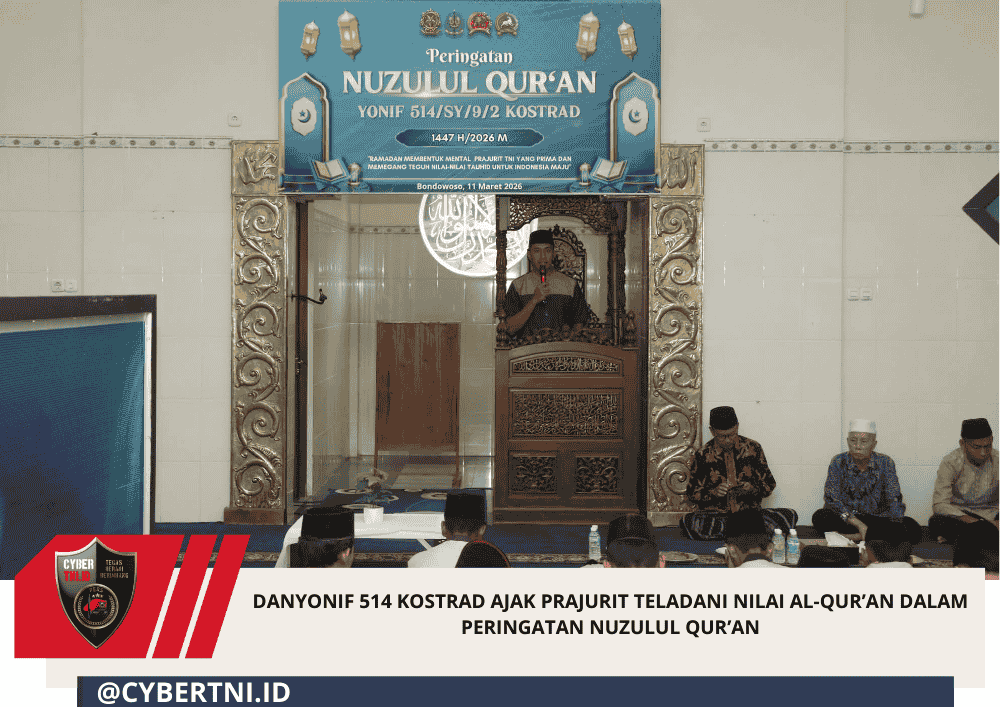 CyberTNI.id | Bondowoso – Dalam rangka memperingati Nuzulul Qur’an 1447 H/2026 M, prajurit Sabaddha Yudha melaksanakan kegiatan pengajian dan santunan anak yatim yang digelar di Masjid Nurul Yaqin Yonif 514 Kostrad, Kecamatan Curahdami, Kabupaten Bondowoso, Senin (16/03/2026).