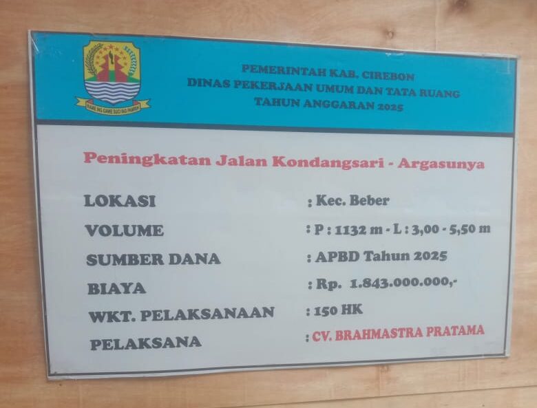 CyberTNI.id | CIREBON — Proyek peningkatan jalan penghubung antara Kabupaten dan Kota Madya Cirebon yang berlokasi di Kecamatan Beber, tepatnya di ruas Kondangsari menuju Argasunya, menuai sorotan tajam. Proyek senilai Rp1.843.000.000,00 yang bersumber dari APBD Tahun Anggaran 2025 itu diduga sarat kejanggalan dan tak sesuai dengan spesifikasi teknis.