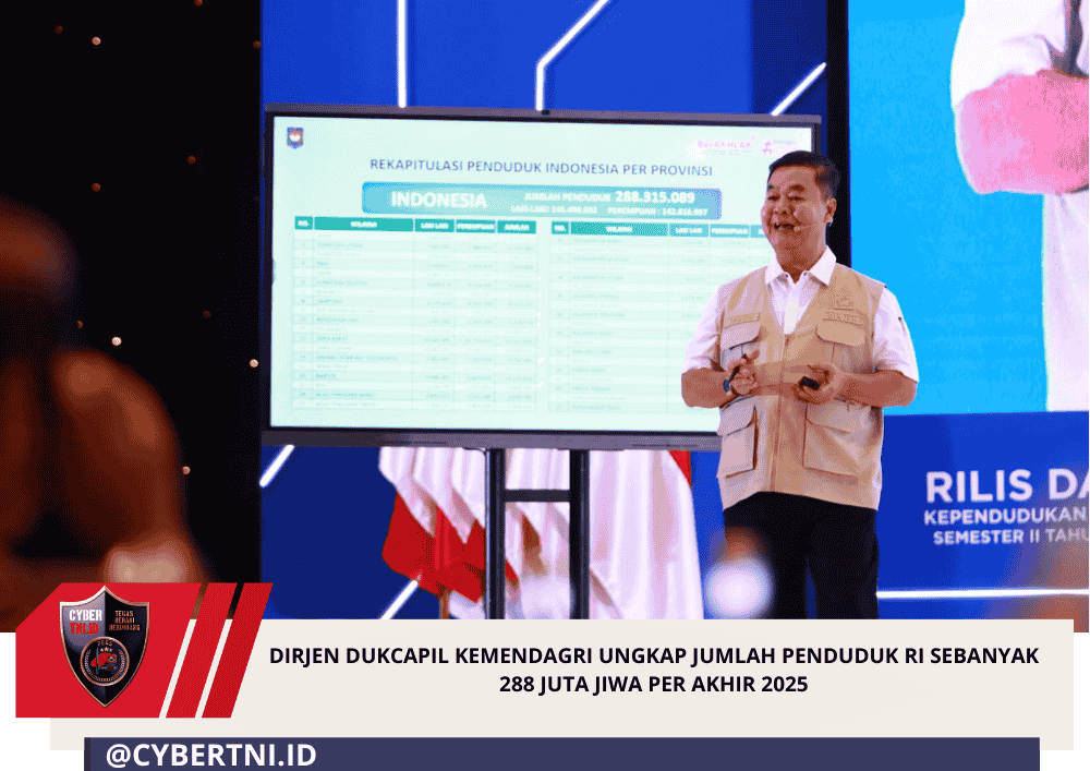 CyberTNI.id | Jakarta – Direktur Jenderal (Dirjen) Kependudukan dan Pencatatan Sipil (Dukcapil) Kementerian Dalam Negeri (Kemendagri) Teguh Setyabudi mengungkapkan data kependudukan bersih semester II tahun 2025. Berdasarkan data tersebut, jumlah penduduk Indonesia per 31 Desember 2025 tercatat sebanyak 288.315.089 jiwa. Jumlah itu mengalami kenaikan sebanyak 1.621.396 penduduk dibandingkan dengan rilis semester I tahun 2025.
