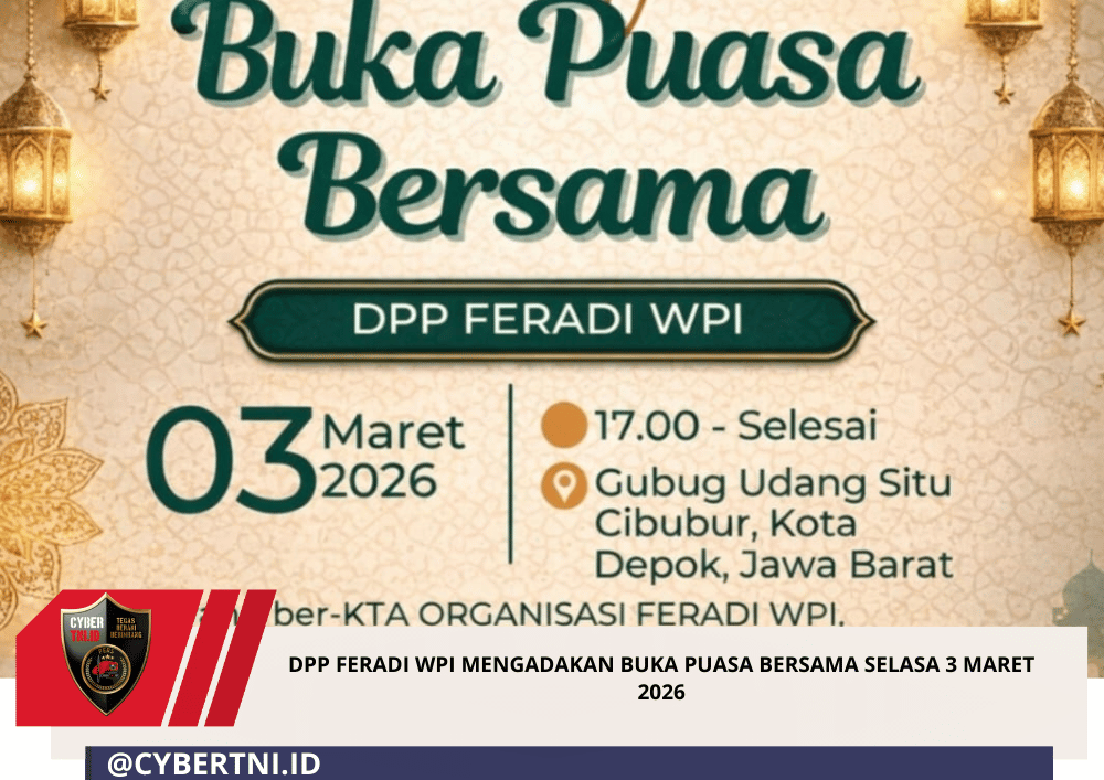 CyberTNI.id | Jakarta, Kamis 19 Feb 2026 — ditemui awak media, Ketua Panitia Acara Buka Bersama DPP FERADI WPI – Bendum IV DPP Muhammad Adji Setiadji, S.H., C.PFW., C.MDF., C.JKJ. beserta P.I.C. BUKBER DPP FERADI WPI Waketum Revan Pratama Wijaya, S.H., C.PFW., C.MDF., C.JKJ., Menyampaikan bahwa DPD FERADI WPI Jakarta akan mengadakan Agenda buka puasa bersama di Hari Selasa 3 Maret 2026. Mulai pk.17.00 – Selesai. Bertempat di Resto Gubug Udang Situ Cibubur, Jalan Alternatif Cibubur Nomor 4, Kota Depok, Jawa Barat. Semoga acara ini bisa mempererat tali persaudaraan antar sesama anggota dan pengurus FERADI WPI seluruh Indonesia.