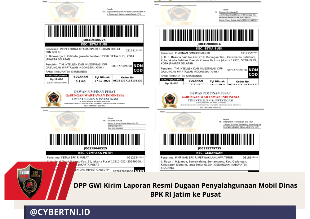 CyberTNI.id | Situbondo, 25 Desember 2025 — Dewan Pimpinan Pusat Gabungan Wartawan Indonesia (DPP GWI) menegaskan komitmennya dalam pengawasan penggunaan aset negara. Hari ini, DPP GWI secara resmi mengirimkan Surat Laporan Dugaan Penyalahgunaan Kendaraan Dinas Negara oleh oknum yang mengaku sebagai pegawai BPK RI Perwakilan Provinsi Jawa Timur ke sejumlah lembaga negara terkait.