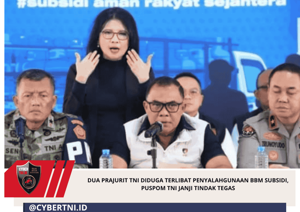 CyberTNI.id|JAKARTA,Selasa (7/4/2026) — Wakil Komandan Pusat Polisi Militer (Wadanpuspom) TNI Marsekal Pertama Bambang Suseno mengungkap ada dua prajurit TNI yang diduga terlibat dalam kasus penyalahgunaan bahan bakar minyak atau BBM bersubsidi. Bambang mengungkap itu dalam konferensi pers yang digelar di Lapangan Bhayangkara Polri, Jakarta Selatan