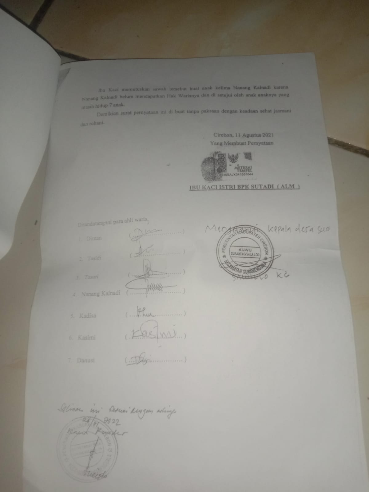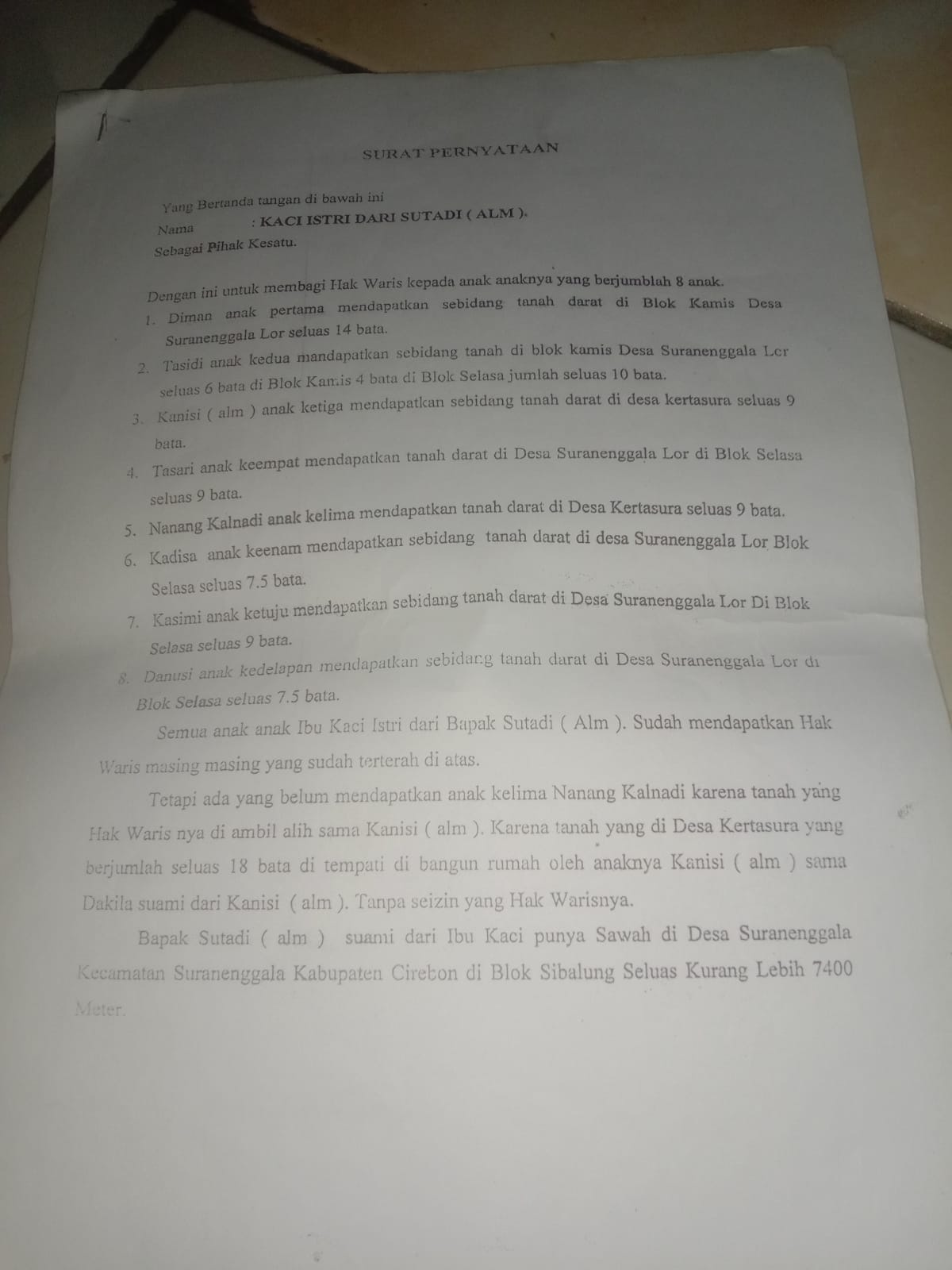 Saat almarhumah Ibu Kaci masih hidup, lanjut Nanang, keluarga telah melakukan pembagian ulang dengan mengganti bagian miliknya berupa lahan sawah di Blok Sibalung, Desa Suranenggala. Pembagian tersebut disaksikan oleh tujuh anak almarhum yang masih hidup serta Kepala Desa Suranenggala Lor saat itu, almarhum Kuwu Sawilo. Namun, Nanang mengaku lahan tersebut tetap dikuasai oleh Dakila dan anaknya, Tatang.