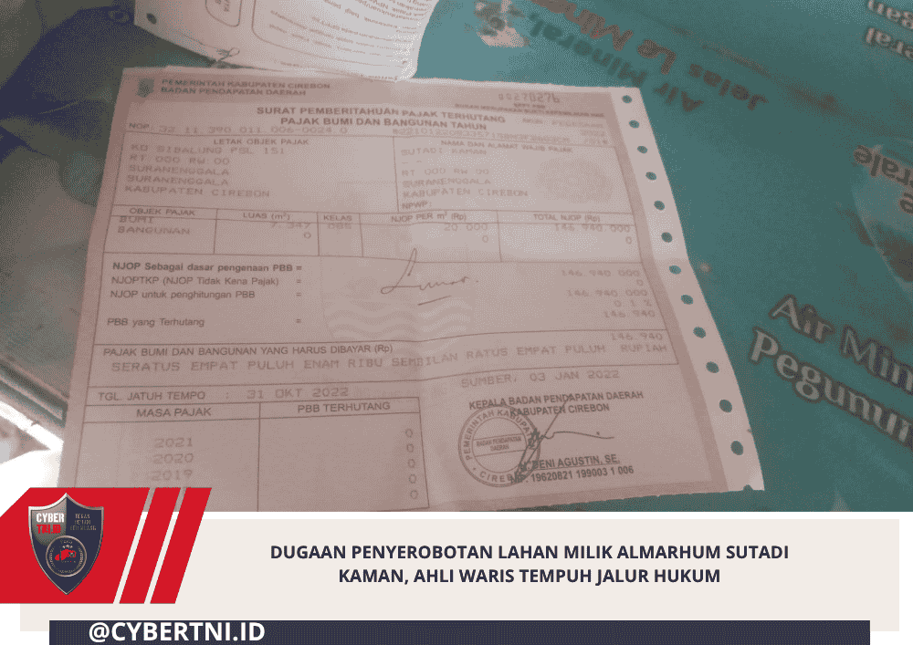 CyberTNI.id | Cirebon, 20 April 2026 – Kasus dugaan penyerobotan lahan milik almarhum Sutadi Kaman yang berlokasi di Desa Suranenggala Lor, Kecamatan Suranenggala, Kabupaten Cirebon, kini memasuki babak baru. Salah satu ahli waris, Nanang Kalnadi, menyatakan akan menempuh jalur hukum terkait penguasaan lahan yang diduga dilakukan oleh mantu keluarga, Dakila.