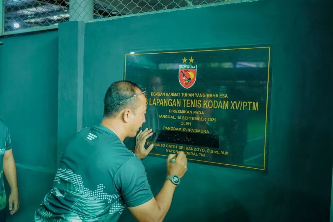 CyberTNI.id | Ambon ,Jumat 12 September 2025 — Pangdam XV/Pattimura secara resmi menandatangani prasasti hasil renovasi lapangan tenis Indoor Tapal Kuda di Kediaman Pangdam XV/Pattimura, Air Salobar, Ambon, Jumat (12/09/2025).