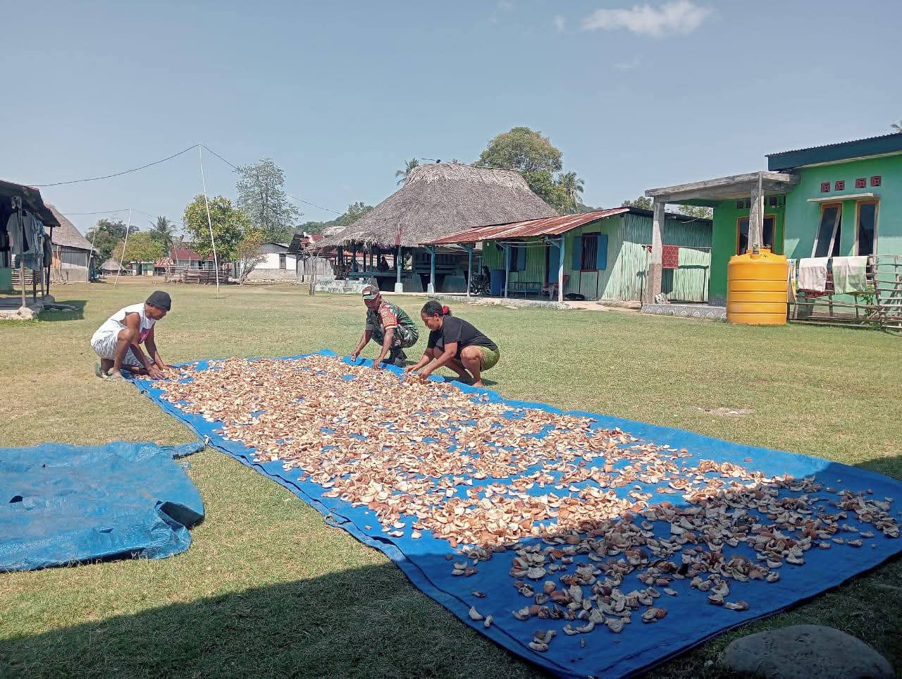 CyberTNI.id | Belu, Kamis 9 Oktober 2025 — KODIM 1605/BELU, Babinsa Desa Litamali Koramil 1605-05/Kobalima Sertu Maximus Nahak dalam tugas pemantauan wilayah binaan membantu Keluarga Bapak Yosep Bou menjemur kopra di Dusun Wemasa, Desa Litamali, Kecamatan Kobalima, Kabupaten Malaka, Kamis (9/10/2025).