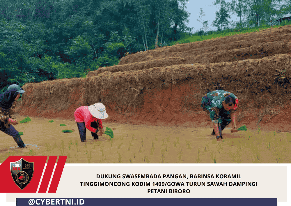 CyberTNI.id | GOWA – Komitmen dalam menyukseskan program ketahanan pangan nasional terus dibuktikan oleh jajaran Kodim 1409/Gowa di lapangan. Babinsa Kelurahan Bontolerung, Sertu Zulkifli, melaksanakan aksi nyata dengan mendampingi proses penanaman padi di Lingkungan Biroro, Kelurahan Bontolerung, Kecamatan Tinggimoncong, Kabupaten Gowa. Rabu (22/04/2026).