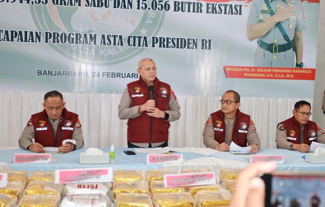 CyberTNI.id | Banjarbaru, Selasa 24 Februari 2026 — Direktorat Reserse Narkoba (Ditresnarkoba) Polda Kalimantan Selatan menggelar konferensi pers pada Selasa (24/2/2026) siang terkait pengungkapan kasus besar peredaran gelap narkotika. Dari tangan seorang kurir, polisi berhasil menyita barang bukti sabu seberat 29.944,33 gram (29,9 Kg) dan 15.056 butir pil ekstasi dengan berat bersih 5.767,47 gram.