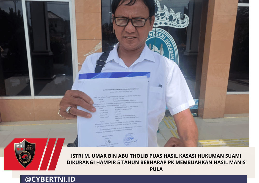 CyberTNI.id | Lampung Timur — Tim kuasa hukum dari Subur Jaya Lawfirm – FERADI WPI secara resmi mengajukan upaya hukum luar biasa Peninjauan Kembali (PK) atas nama terpidana M. Umar Bin Abu Tholib ke Mahkamah Agung Republik Indonesia melalui Pengadilan Negeri Sukadana, Lampung Timur, Rabu (4/2/2026).