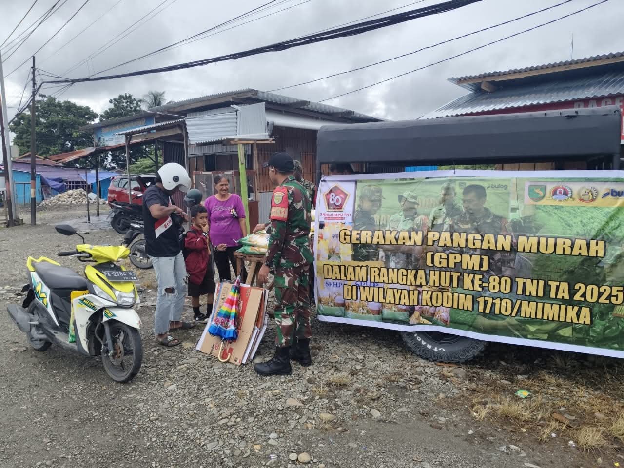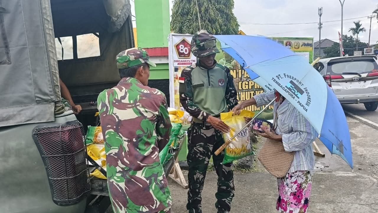 CyberTNI.id | Timika, Sabtu 27 September 2025 – Menyambut peringatan HUT ke-80 TNI, Kodim 1710/Mimika melalui jajaran Koramil bersama Perum Bulog terus menghadirkan program penjualan beras Stabilisasi Pasokan dan Harga Pangan (SPHP) bagi masyarakat Mimika. Kegiatan ini menjadi wujud nyata bakti TNI dalam membantu menjaga stabilitas harga pangan dan ketersediaan beras di tengah masyarakat, Sabtu (27/9/2025).