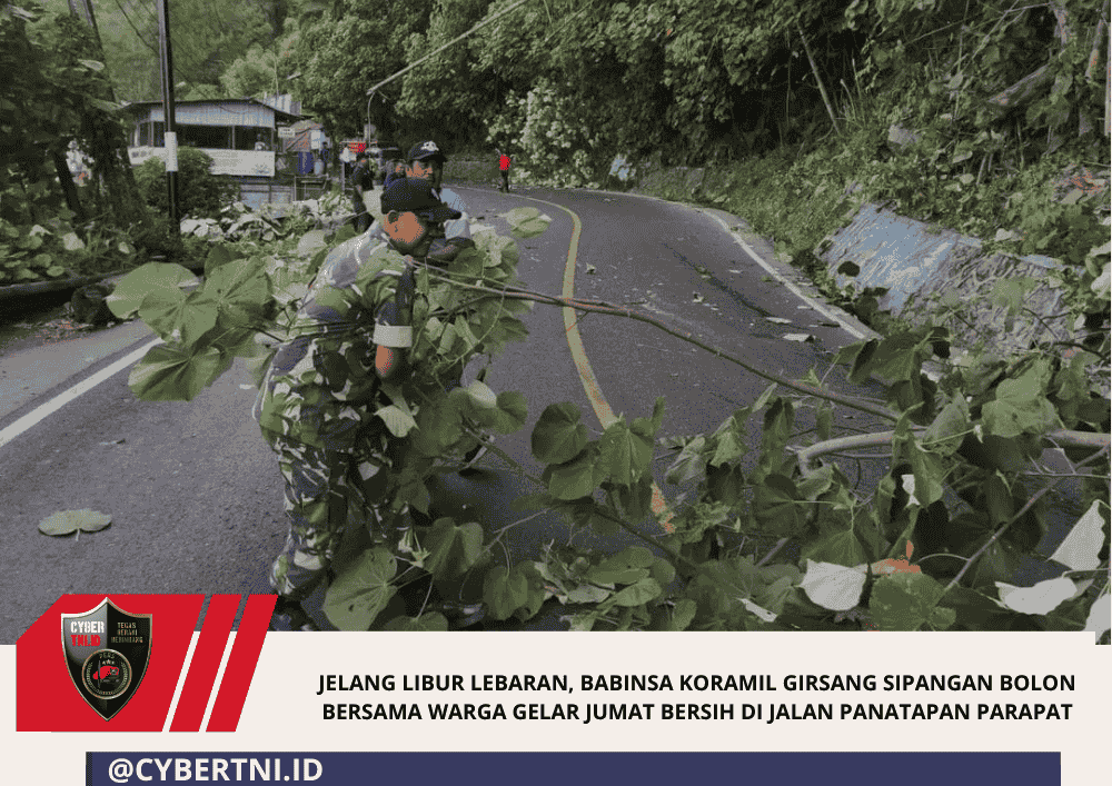 CyberTNI.id |Simalungun, 13 Maret 2026 – Menjelang meningkatnya arus kendaraan saat libur Lebaran, Babinsa Koramil 11/Girsang Sipangan Bolon Kodim 0207/Simalungun bersama pemerintah kecamatan dan masyarakat melaksanakan kegiatan Jumat Bersih dengan bergotong royong membersihkan serta memangkas ranting-ranting pohon di sepanjang Jalan Panatapan Parapat, Jumat (13/3/2026).