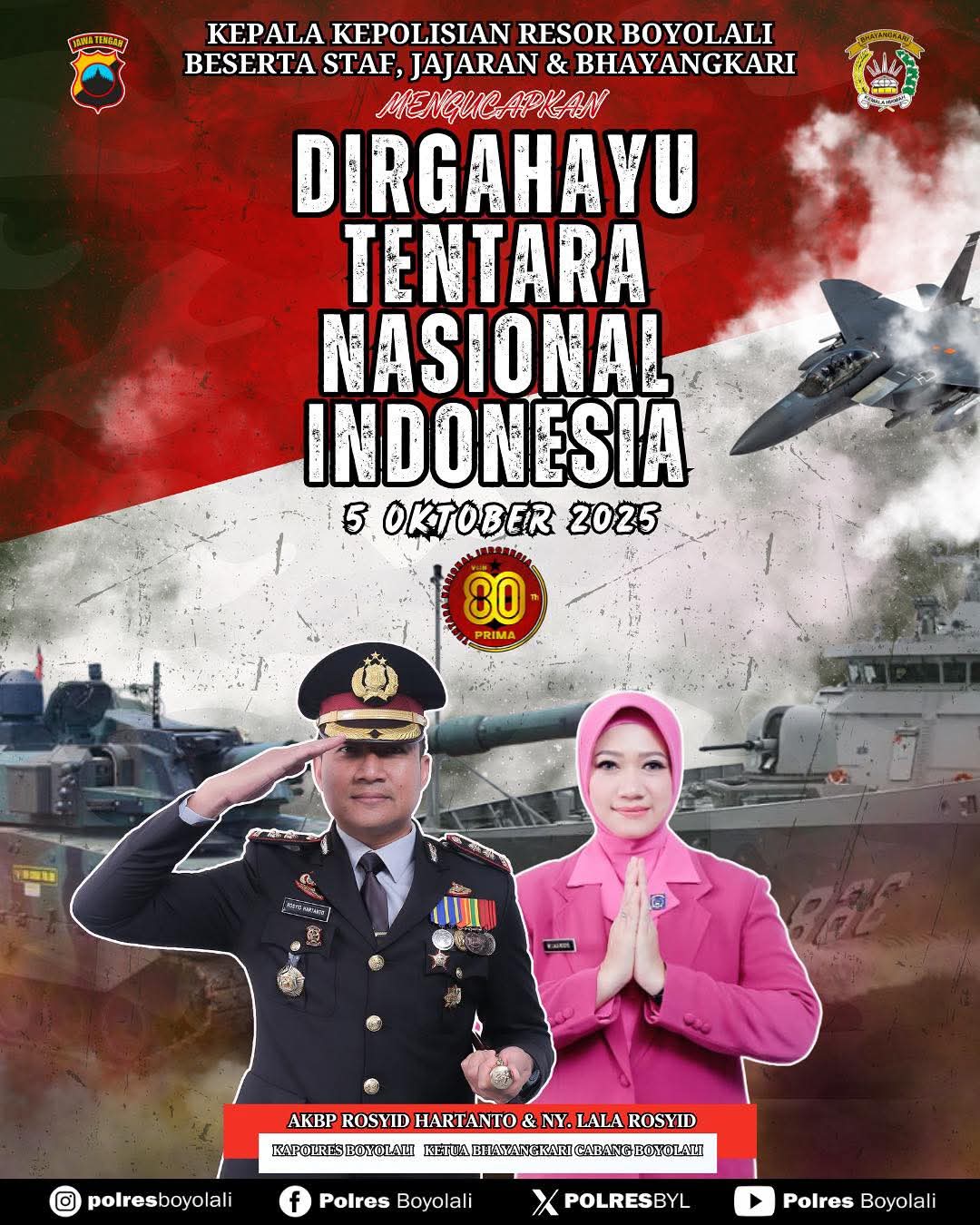 “Dirgahayu Tentara Nasional Indonesia ke-80. Terima kasih atas dedikasi, loyalitas, dan pengabdian luar biasa dalam menjaga keutuhan Negara Kesatuan Republik Indonesia. TNI adalah garda terdepan dan benteng terakhir bangsa. Kami, Polri khususnya Polres Boyolali, akan terus berdiri bersama dalam menjaga keamanan dan ketertiban masyarakat serta mempertahankan kedaulatan negara,” ujar Kapolres dalam keterangan resminya, Sabtu (5/10/2025).
