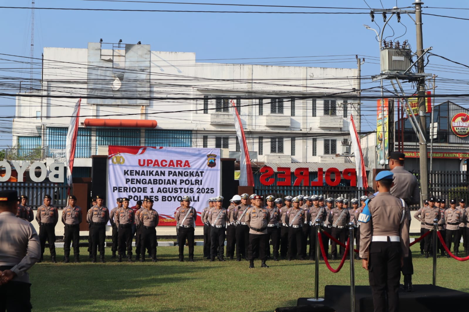 CyberTNI.id | Boyolali — Suasana khidmat menyelimuti halaman Mapolres Boyolali pada Kamis pagi (31/7/2025), saat digelarnya Upacara Kenaikan Pangkat Pengabdian Polri periode 1 Agustus 2025. Bertindak sebagai Inspektur Upacara, Kapolres Boyolali AKBP Rosyid Hartanto, memimpin langsung jalannya prosesi yang menjadi simbol penghormatan atas pengabdian luar biasa para personel Polri.