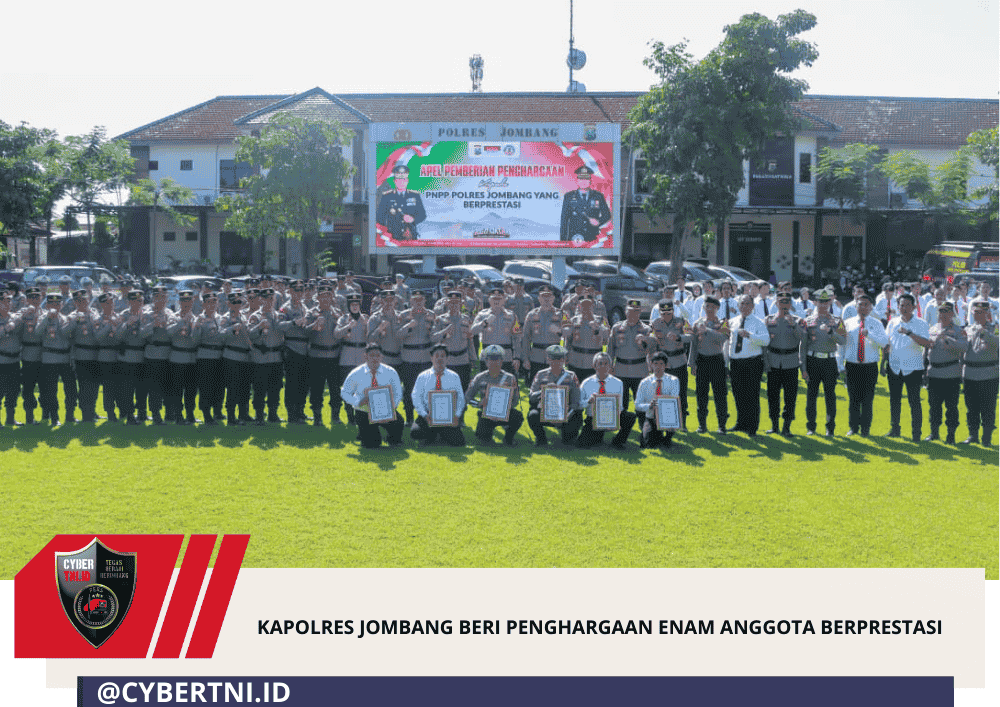 CyberTNI.id | Jombang — Kapolres Jombang AKBP Ardi Kurniawan, S.H., S.I.K., CPHR memberikan penghargaan kepada enam anggota dari Polres Jombang dan jajaran polsek yang dinilai berprestasi dalam pelaksanaan tugas. Penyerahan penghargaan tersebut berlangsung di Lapangan Polres Jombang, Senin (16/3/2026).