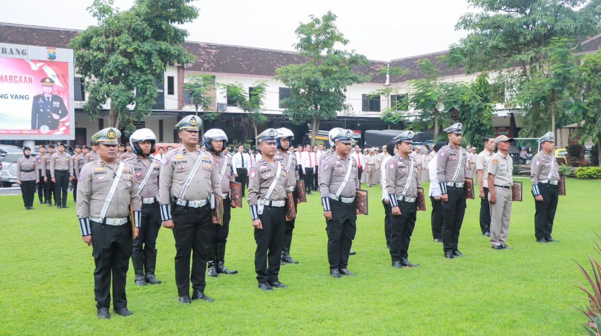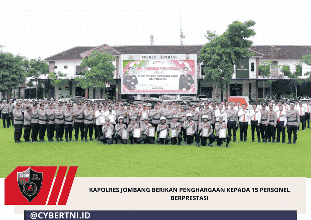 CyberTNI.id | Jombang — Kapolres Jombang Ardi Kurniawan memberikan penghargaan kepada 15 personel berprestasi atas dedikasi dan kinerja di satuan masing-masing dalam mendukung pelaksanaan tugas Kepolisian Negara Republik Indonesia (Polri), khususnya di lingkungan Polres Jombang. Kegiatan tersebut dilaksanakan di lapangan Mapolres Jombang pada Selasa (24/2/2024).