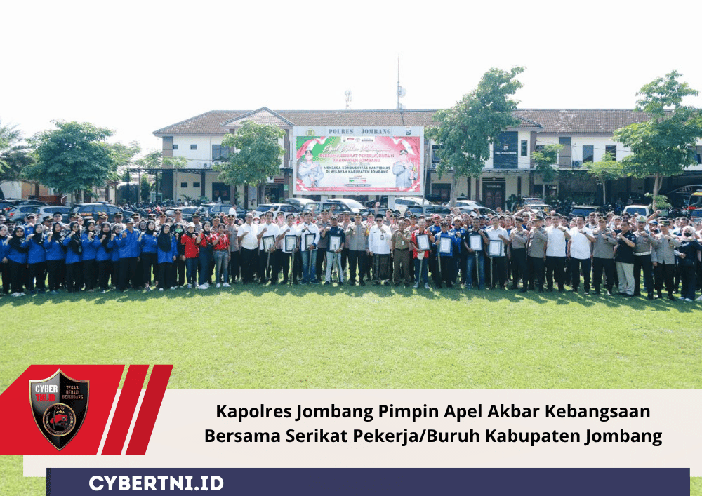 CyberTNI.id | Jombang,Kamis 23 Oktober 2025 – Kapolres Jombang, AKBP Ardi Kurniawan, S.H., S.I.K., CPHR memimpin langsung Apel Akbar Kebangsaan bersama Serikat Pekerja/Buruh Kabupaten Jombang, yang digelar dengan penuh semangat persatuan dan kebangsaan bertempat di Lapangan Mapolres setempat, Kamis (23/10/2025) pagi.