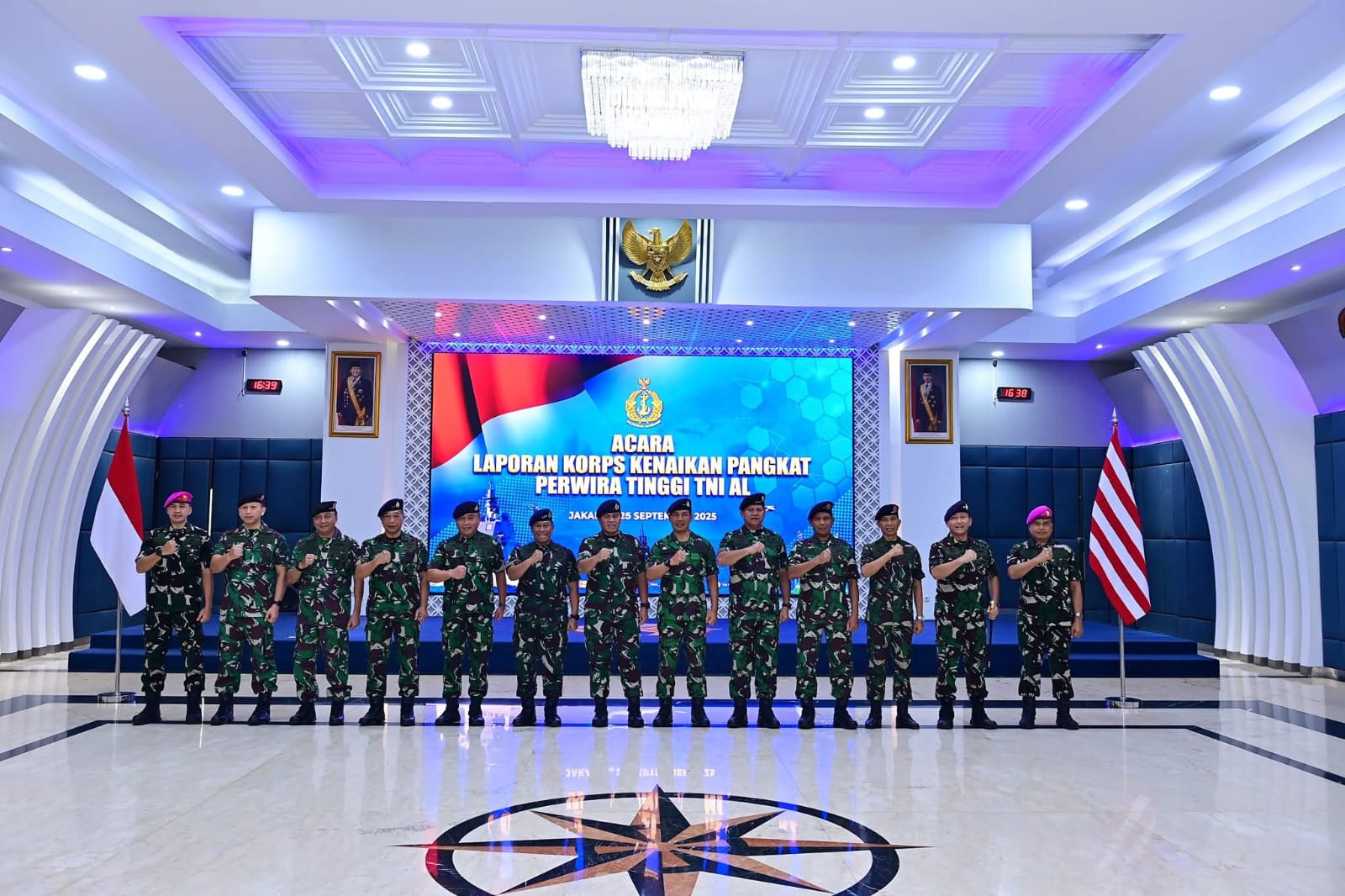 CyberTNI.id | Jakarta, Kamis 25 September 2025 — Dispen Kormar TNI Angkatan Laut. (Jakarta) Kepala Staf Korps Marinir (KAS Kormar) Mayor Jenderal TNI (Mar) Muhammad Nadir, M.Tr.Opsla., melaksanakan upacara laporan kenaikan pangkat perwira tinggi (Pati) yang diikuti oleh beberapa Pati TNI AL, upacara dipimpin langsung Kepala Staf Angkatan Laut (Kasal) Laksamana TNI Dr. Muhammad Ali, S.E., M.M., M.Tr.Opsla., bertempat di Wisma Elang Laut, Jalan Pangeran Diponegoro, Menteng, Jakarta Pusat, Kamis (25/09/2025).