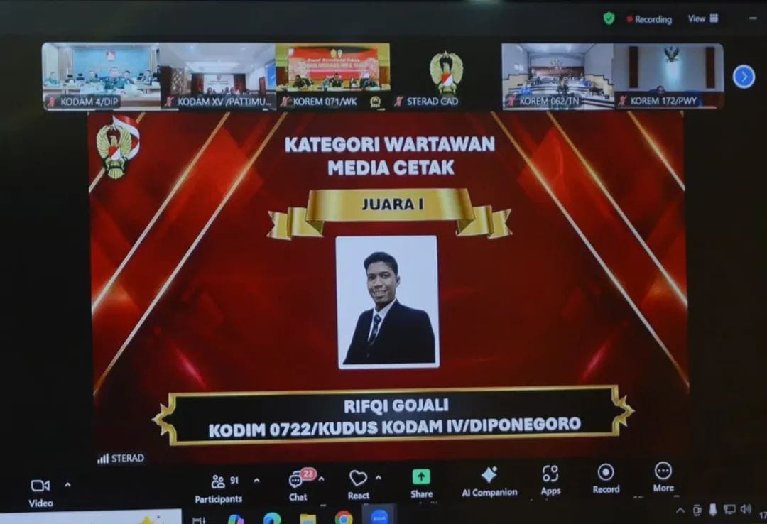 Untuk kategori Wartawan Media Cetak, Juara Pertama berhasil diraih Rifqi Gozali dari Tribunnews berkat karyanya berjudul “Janjar Cuma Butuh Latihan Sehari untuk Ikut Tari Kretek Kolosal” di wilayah Kodim 0722/Kudus, Korem 073/Makutarama.