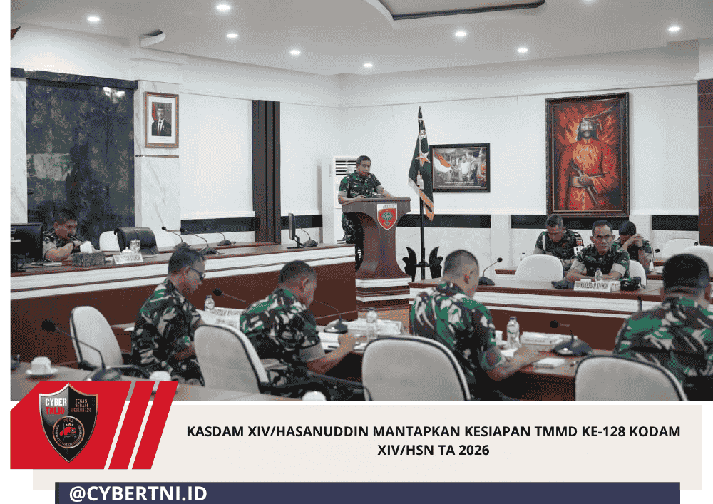 CyberTNI.id | Makassar – Kepala Staf Kodam (Kasdam) XIV/Hasanuddin, Brigjen TNI Sugeng Hartono, S.E., M.M., menerima paparan kesiapan pelaksanaan kegiatan TNI Manunggal Membangun Desa (TMMD) ke-128 Kodam XIV/Hasanuddin TA 2026, bertempat di Ruang Bina Yudha (RBY) Makodam, Jl. Urip Sumoharjo, Kota Makassar. Senin, (6/4/2026).
