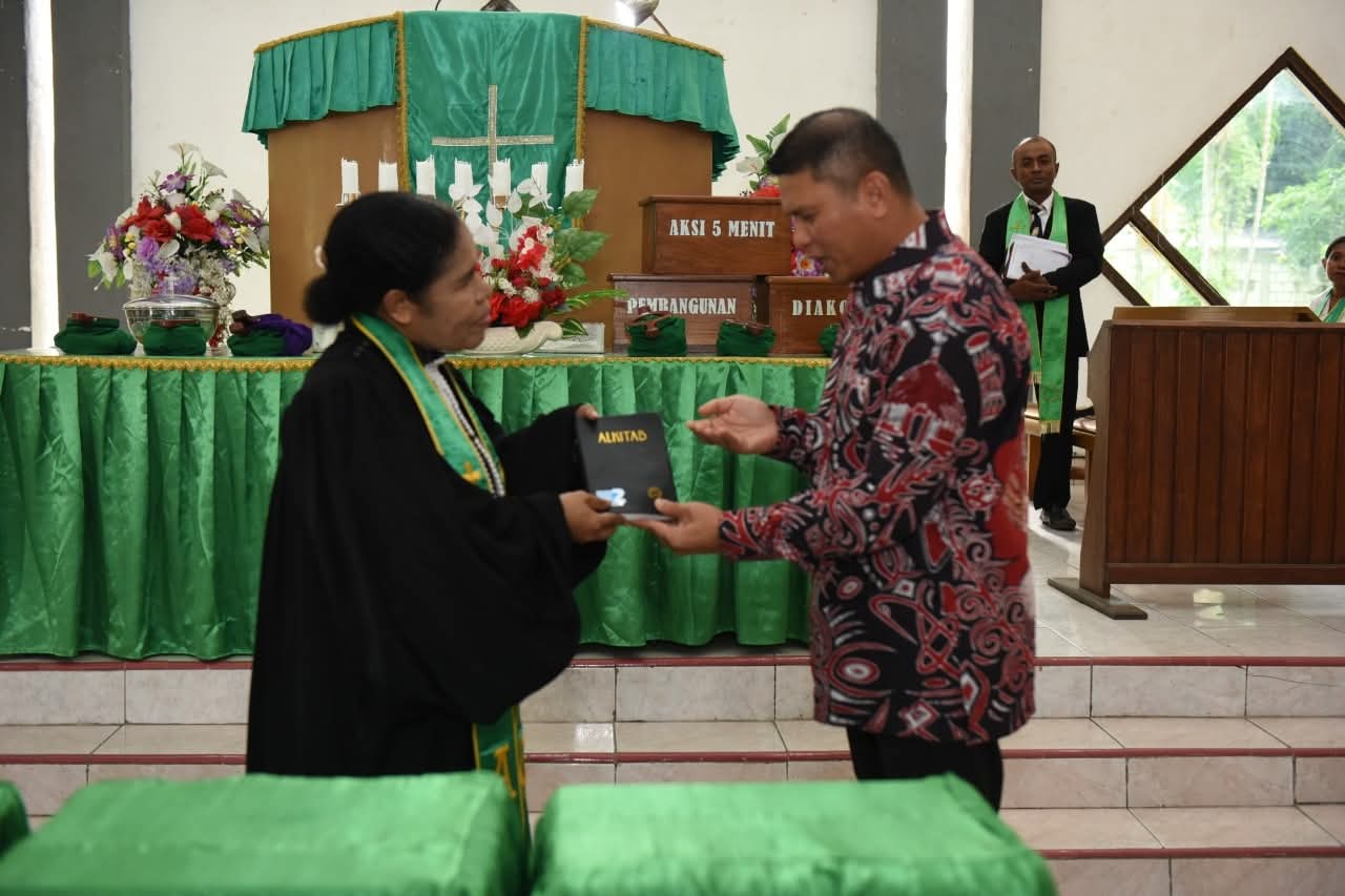Sebagai wujud kepedulian dan kasih, Kasdam XVII/Cenderawasih turut memberikan tali asih berupa Alkitab dan paket Sembako kepada pihak gereja yang diterima langsung oleh Pendeta Josina Redjawue selaku Ketua Majelis Jemaat GKI Onomi Flavauw.