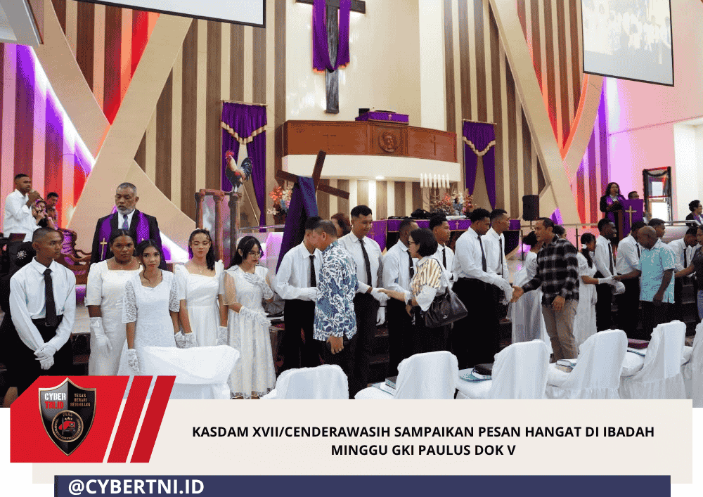 CyberTNI.id | Jayapura ~ Suasana hangat dan penuh haru menyelimuti ibadah Minggu di Gereja GKI Paulus Dok V Atas, Distrik Jayapura Utara, Kota Jayapura, Minggu (29/3/2026). Momen tersebut menjadi istimewa dengan kehadiran Kepala Staf Kodam (Kasdam) XVII/Cenderawasih, Mayjen TNI Thevi A. Zebua, S.E., M.M, bersama Wakil Ketua Persit Kartika Chandra Kirana Daerah XVII/Cenderawasih, Ny. Rieli Thevi Zebua.